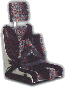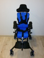 Individuálně zhotovená stabilizační, respektive korekční sedačka s nastavením sklonu zádové opěry a opěrky hlavy.